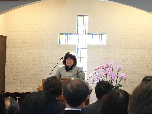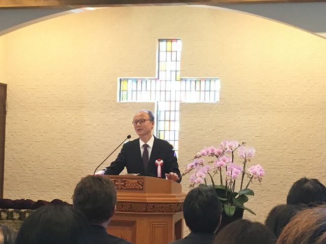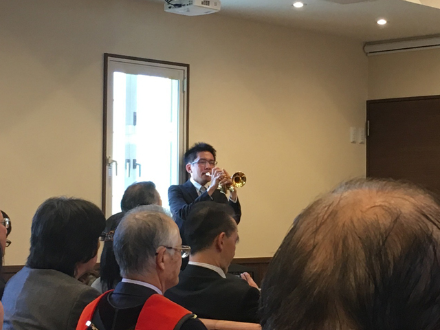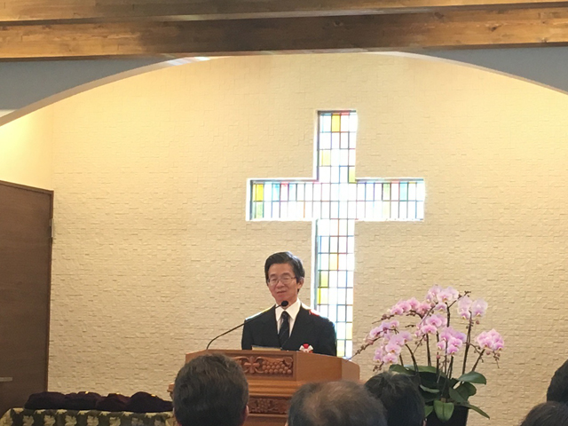 担当牧師、宋ヨシュア師の司会で、高らかなトランペットのファンファーレに始まり、聖歌隊の賛美、建築委員会「ハガイプロジェクト」のリーダーによる経過報告と、恵みの内に礼拝は進み、オープン記念メッセージは、近江福音自由教会の浜岡正年牧師。